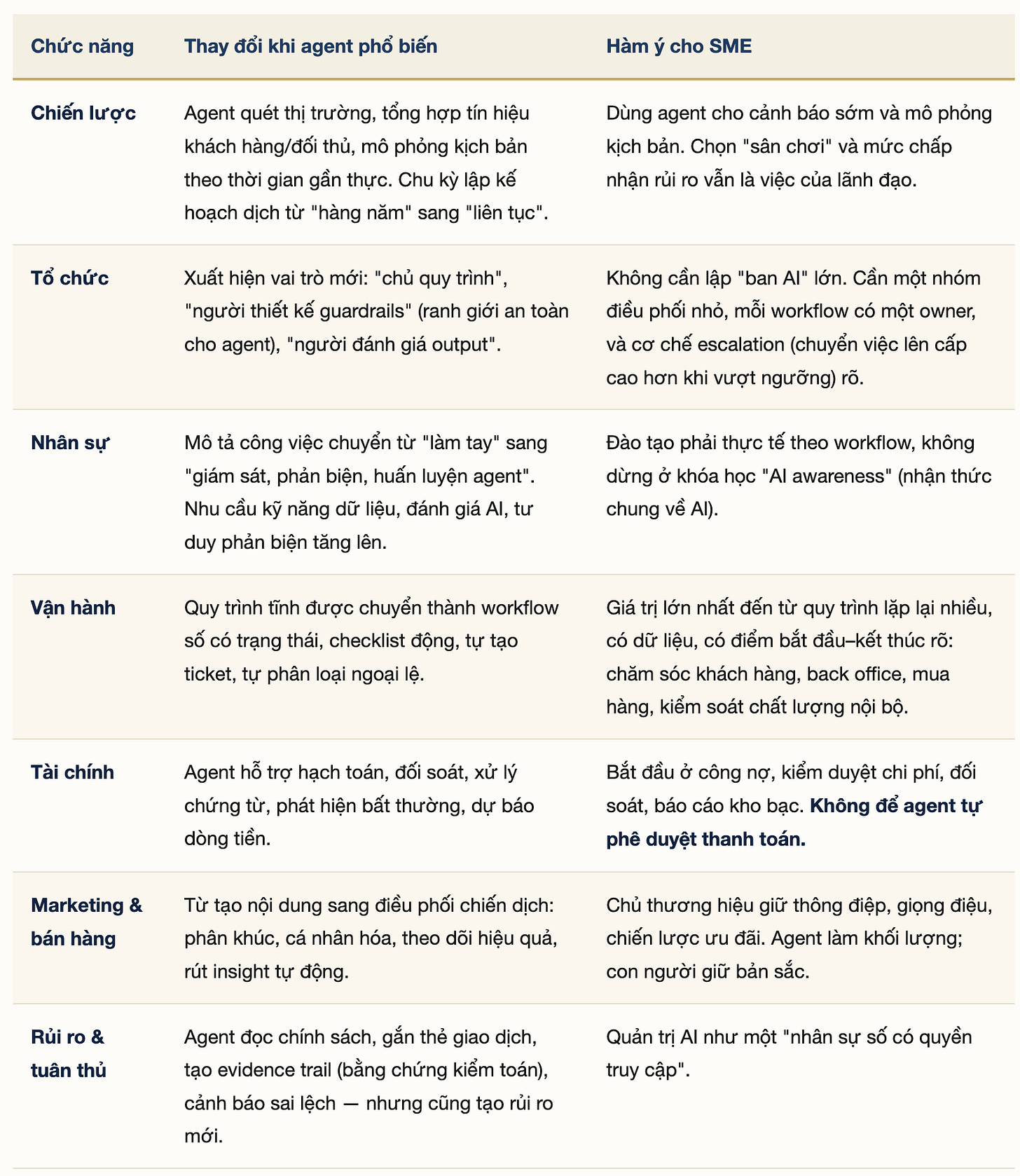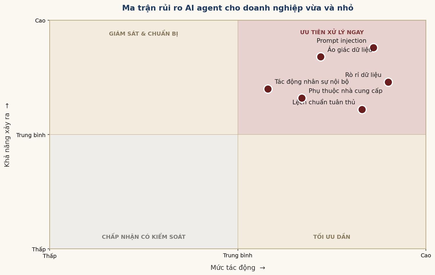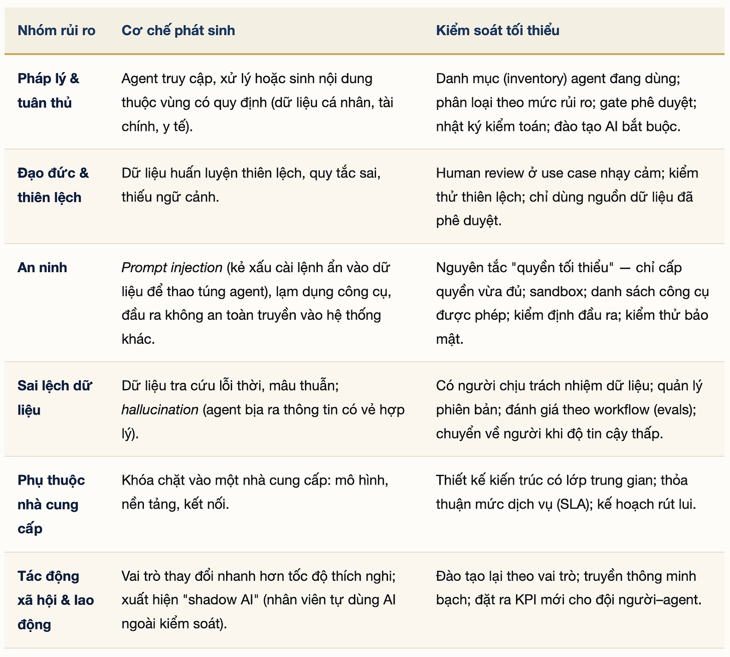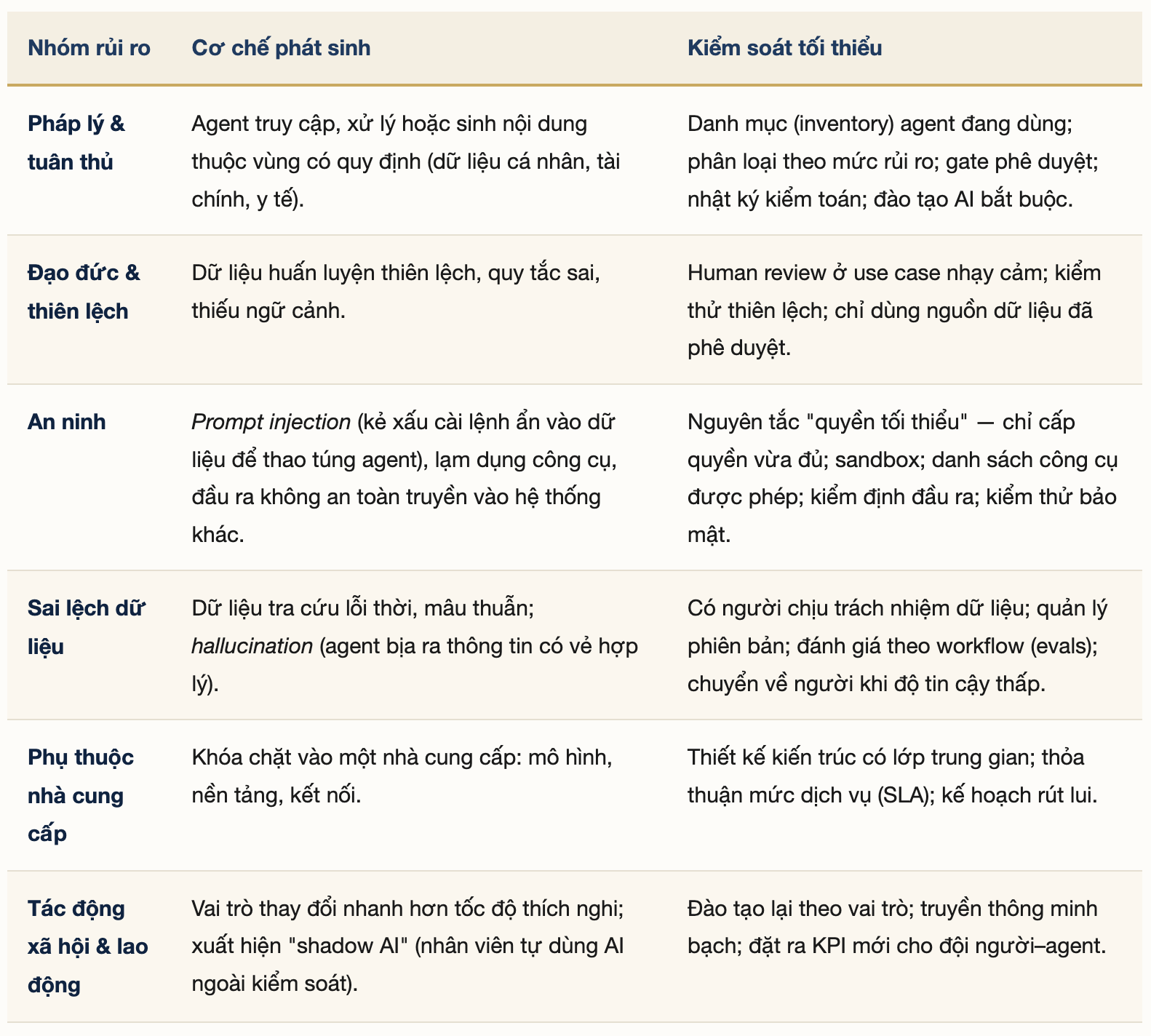 Một luận điểm cần nhấn mạnh: rủi ro lớn nhất của SME không phải là AI “quá mạnh”, mà là quản trị “quá yếu”. Một agent bình thường nhưng được cấp quyền quá rộng, kết nối vào dữ liệu kém chất lượng và vận hành không có nhật ký — còn nguy hiểm hơn một mô hình rất mạnh nhưng bị giới hạn đúng cách.